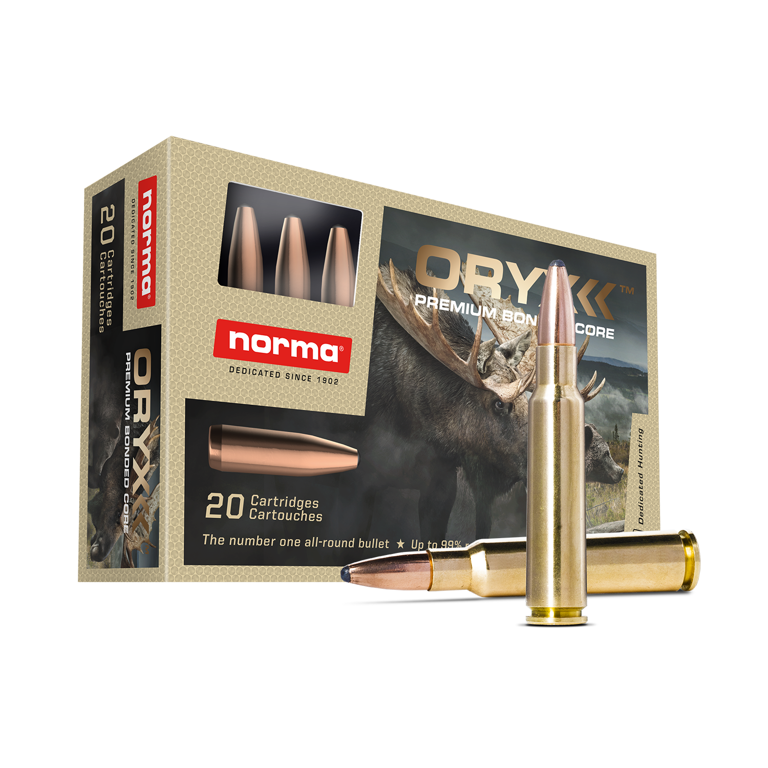 Sedan introduktionen av ORYX 1996, har den blivit spjutspetsen i Normas sortiment. Världen över har den prisats för sin prestanda. Vad är det då som gör ORYX så unik? Jo, en kombination av snabb expansion för dödande skott, samt hög restvikt och djupverkan för de mer krävande skotten. Oryx är en sk. bondad kula, vilket innebär att manteln och kärnan är hoplödda. Kulan öppnar sig alltså snabbt, men sammanlödningen gör att separation av mantel och kärna förhindras, vilket leder till restvikter på över 90%. Till ORYX använder Norma ett mycket avancerat smältningsförfarande som ger en överlägsen vidhäftning mellan mantel och kärna. För en perfekt kontrollerad expansion, även i låga farter eller vid mjukdelsträffar, måste den främre mantelväggen tunnas ut och dimensioneras på rätt sätt. Spetsen på ORYX har invändiga klyvningszoner och med en speciell teknik lämnas den yttersta delen av spetsen obondad. Det är dessa detaljer som skiljer ORYX från andra bondade kulor och ger ett brett användningsområde under de mest skiftande jaktförhållandena. ORYX tillverkas i en rad kalibrar, bl.a. 222Rem, 223Rem, 220 Swift, 22-250, 6mm BR, 6XC, 243Win, 6,5x55, 6,5-284, 270Win, 270WSM, 7x57R, 7x57, 7x65R, 280Rem, 7x64, 7mm Rem Mag, 7mm Blaser Mag, 7,5x55 Swiss, 308Win, 30-06, 300WSM, 308 Norma Mag, 300 Win Mag, 300 Blaser Mag, 8x57JS, 8x57JRS, 338 Win Mag, 338 Blaser Mag, 35 Whelen, 358 Norma Mag, 9,3x57, 9,3x62, 9,3x74R, 375 H&H Mag och 375 Blaser Mag.